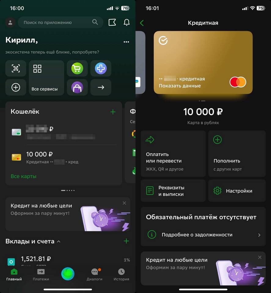 - Выберите нужную карту или счет в главном меню